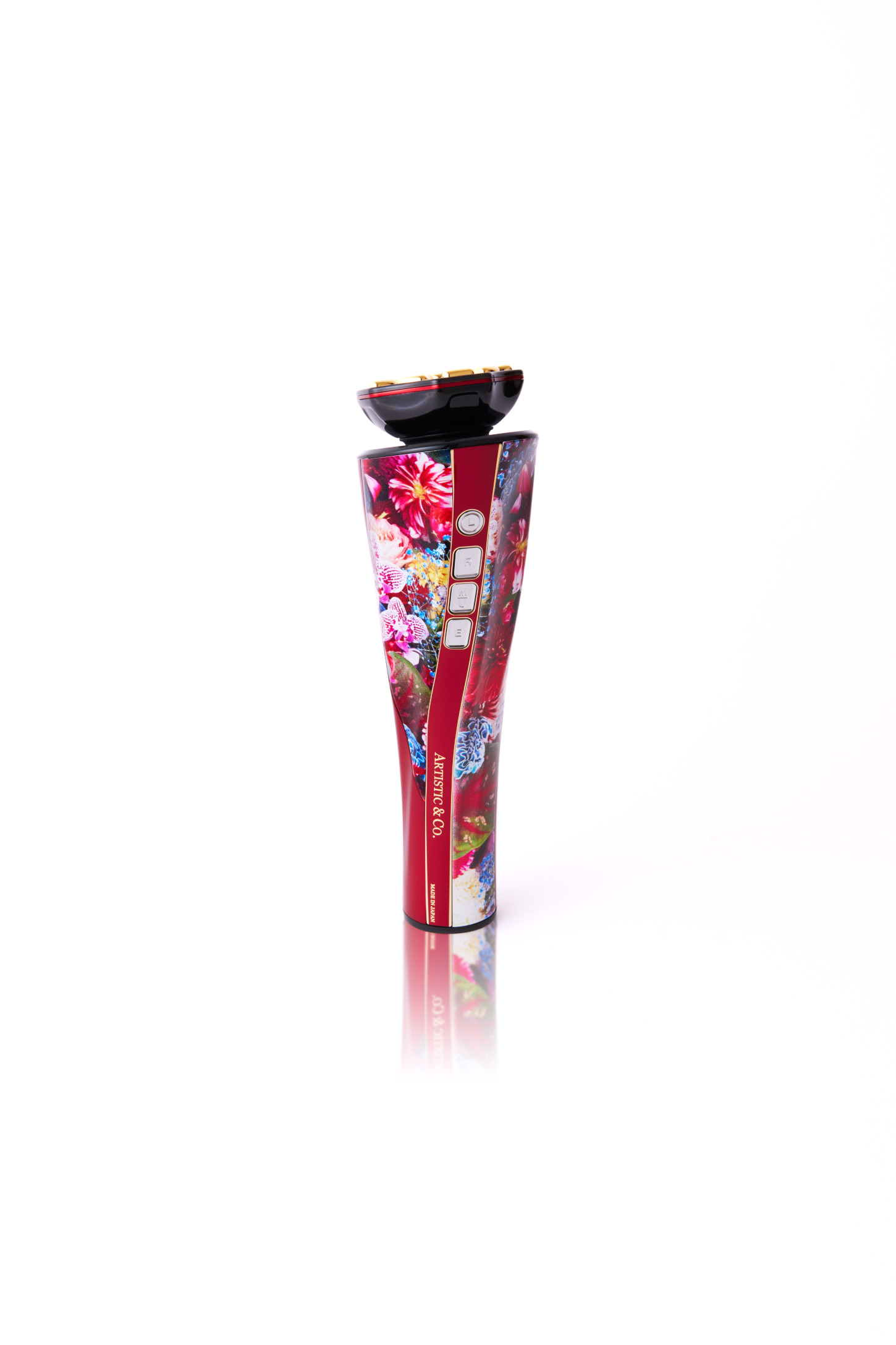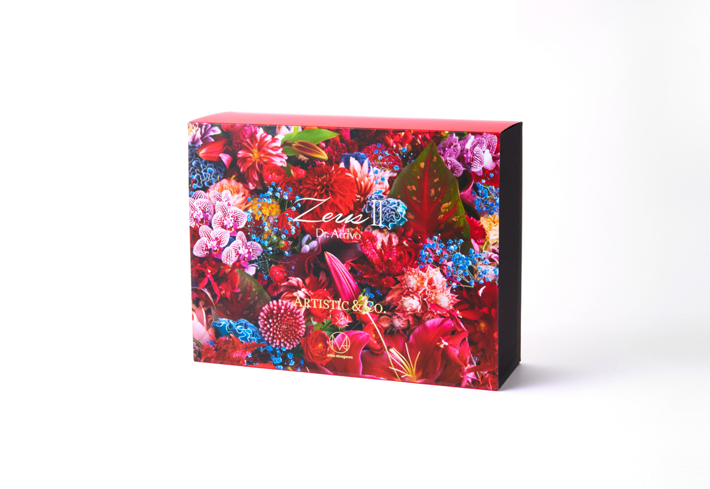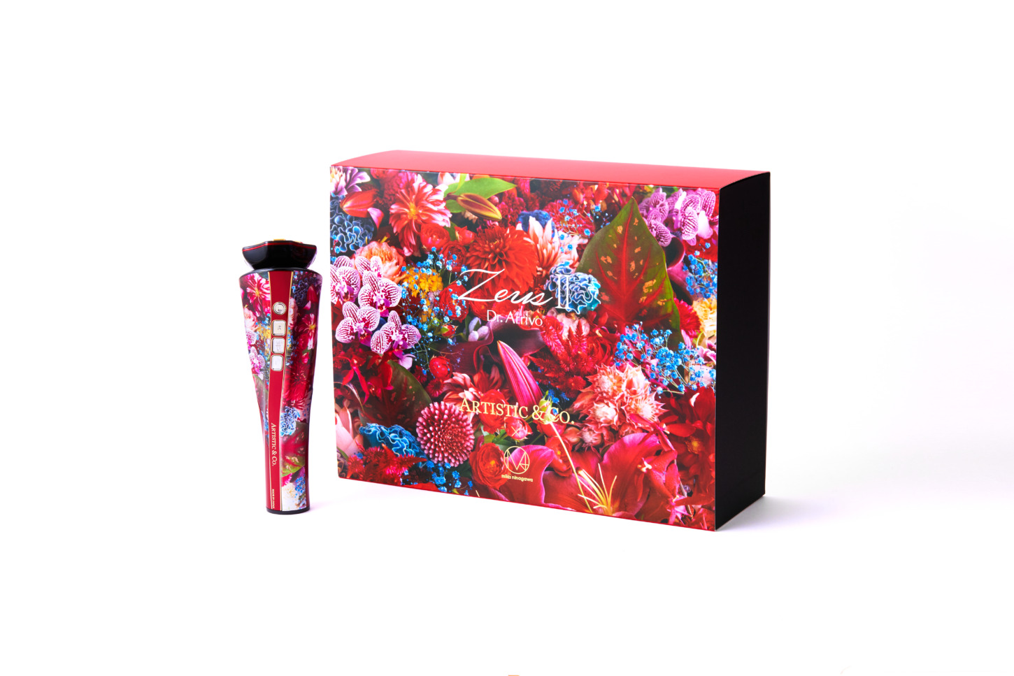 人気の高い美顔器「Dr. Arrivo」の中でも最もハイスペックな「ゼウスII」の本体に、美しいフラワーモチーフのグラフィックをプリント。同じ柄の特性ボックス入りで、同柄のスカーフもセットに。